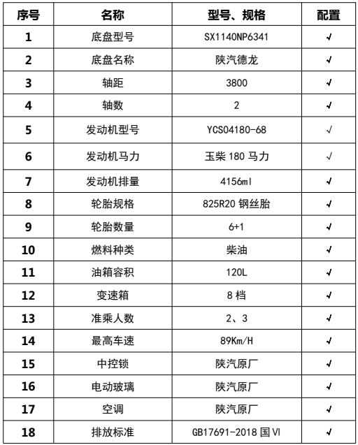 1,僅采用軸距3800mm;2、該車廣泛應用于修筑高等級公路瀝青路面灑布作業(yè),主要專用裝置瀝青罐體,瀝青噴灑系統(tǒng),罐體總?cè)萘?7.52立方米,有效容積:7.17立方米,罐體外形尺寸(長×寬×高)(mm):3600×2100×1550,介質(zhì):液態(tài)瀝青,密度:900千克/立方米;罐體保溫層厚度為50mm;3、側(cè)防護材料采用鋁合金,螺栓連接;后防護由專用裝置代替,下邊緣離地高400mm;4、ABS系統(tǒng)生產(chǎn)廠家:西安正昌電子股份有限公司,型號:ZQFB-V;后部安裝工作燈,僅在夜間駐車狀態(tài)下起照明作用,行駛過程中不可點亮。隨底盤選裝駕駛室;選裝駕駛室前擋風玻璃處增加攝像頭布置外觀。