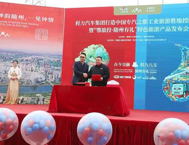 在程力工業(yè)旅游產(chǎn)品發(fā)布會上,程力汽車集團(tuán)總經(jīng)理程阿羅(左)與鄂旅投總經(jīng)理王濤,簽署了文化旅游戰(zhàn)略合作框架協(xié)議,雙方?jīng)Q定利用各自的優(yōu)勢強(qiáng)強(qiáng)聯(lián)合,共同開發(fā)工業(yè)旅游潛在市場,為隨州的經(jīng)濟(jì)發(fā)展增添新的動能。